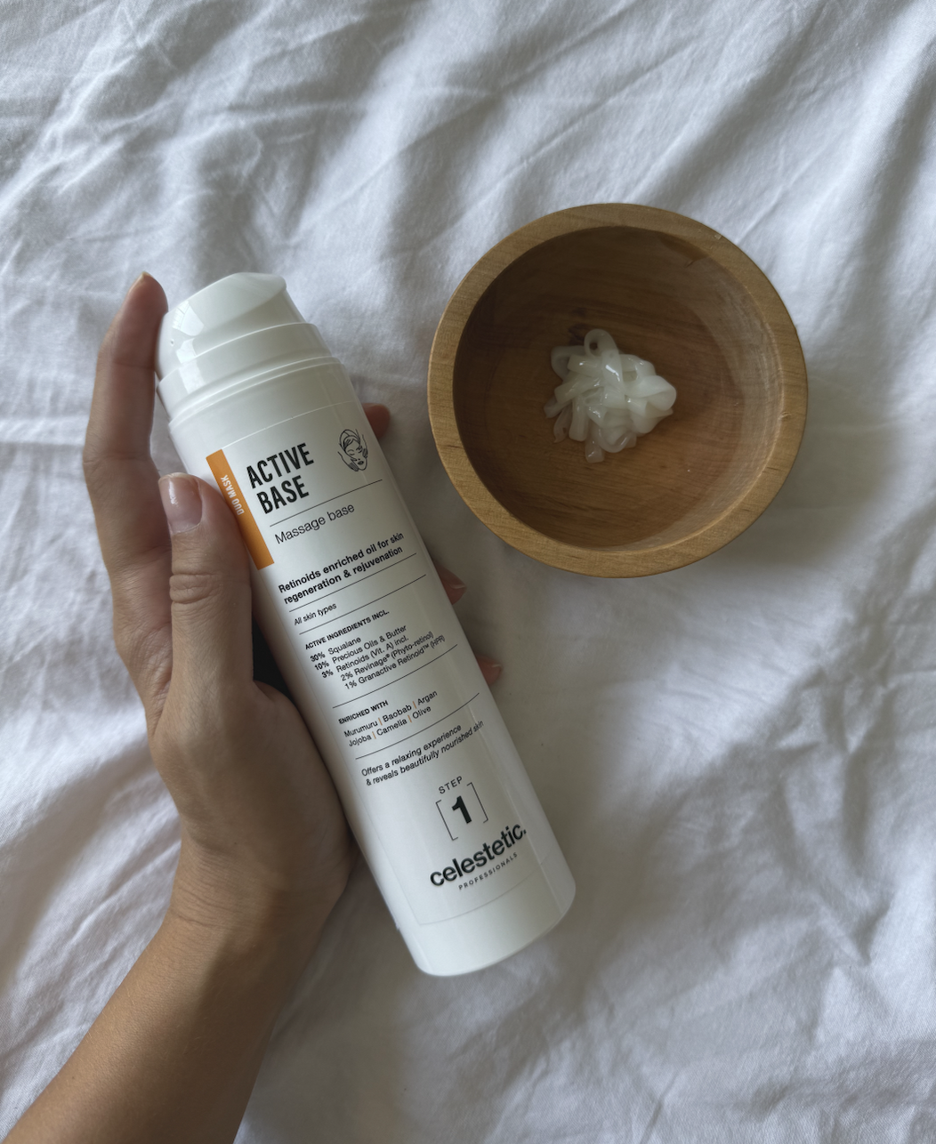 Перший етап процедури – масажна маска Active Base. Її оксамитова текстура та багатий склад (сквалан, ретиноїди, дорогоцінні олії камелії, баобабу, жожоба, масла муру-муру) створюють ідеальні умови для ручного масажу та глибокого живлення шкіри. Маска забезпечує тривале зволоження, антивіковий ефект, зміцнення бар’єру та помітне сяйво вже після першої процедури.